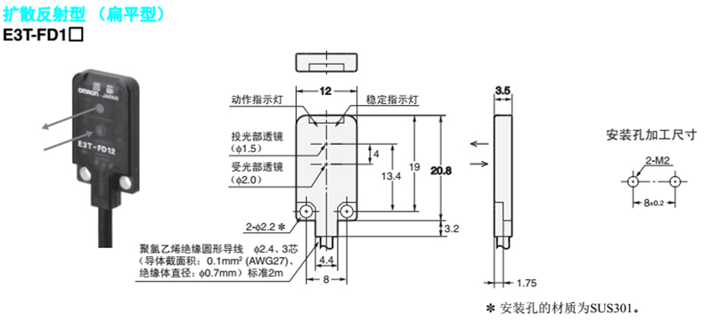 欧姆龙OMRON 光电传感器,E3T-FD12 2M