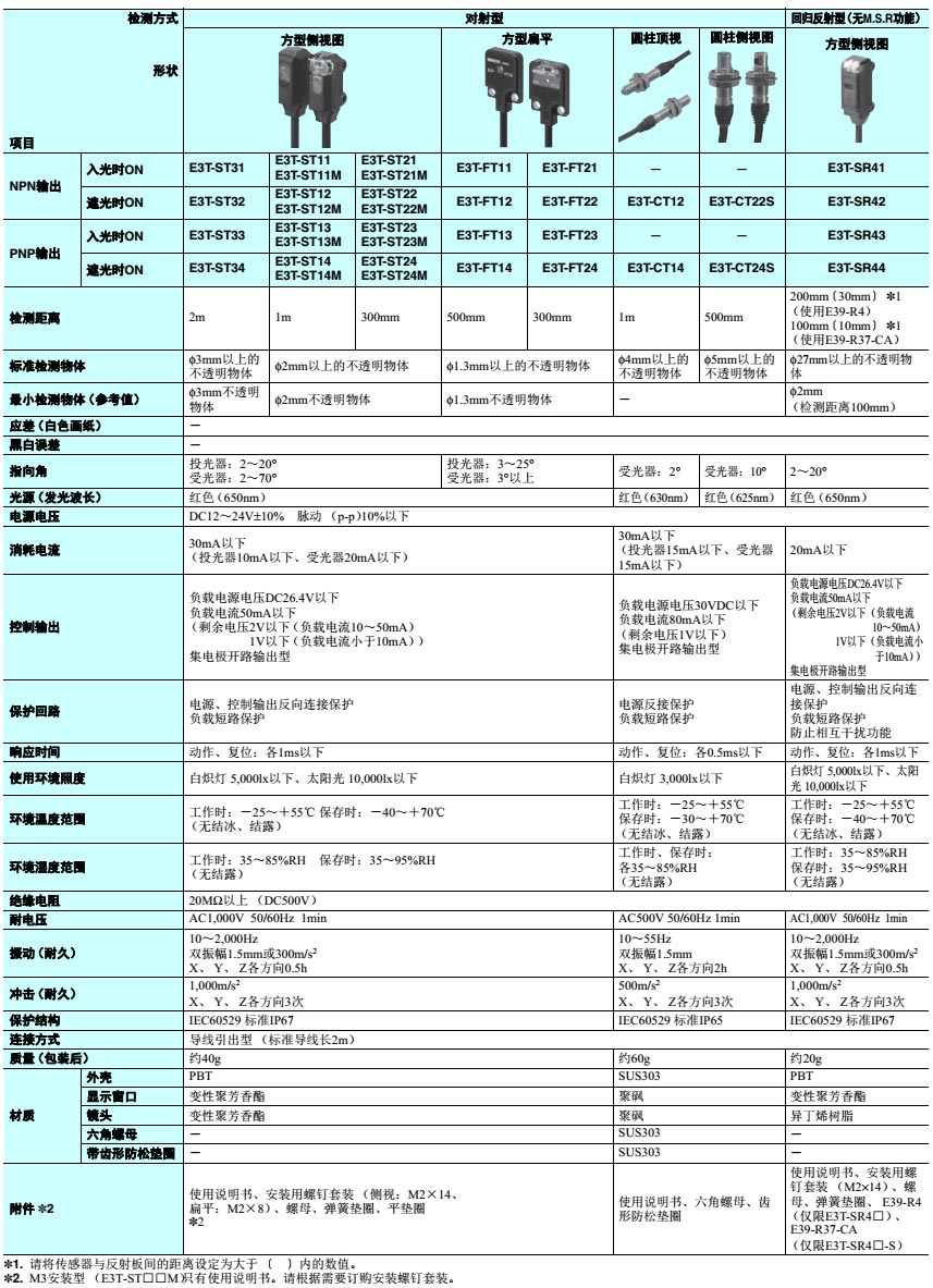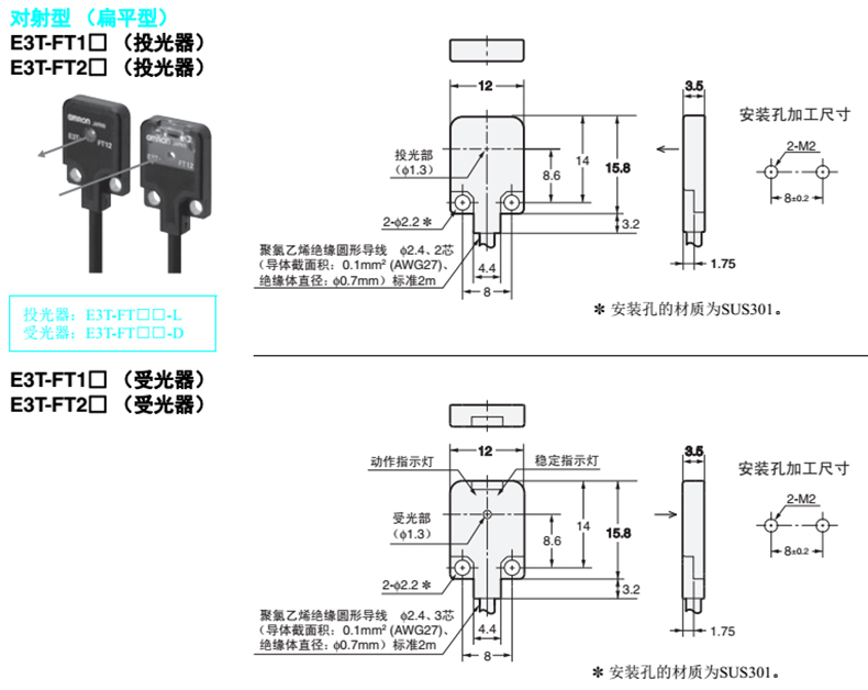 欧姆龙OMRON 光电传感器,E3T-FT21 2M