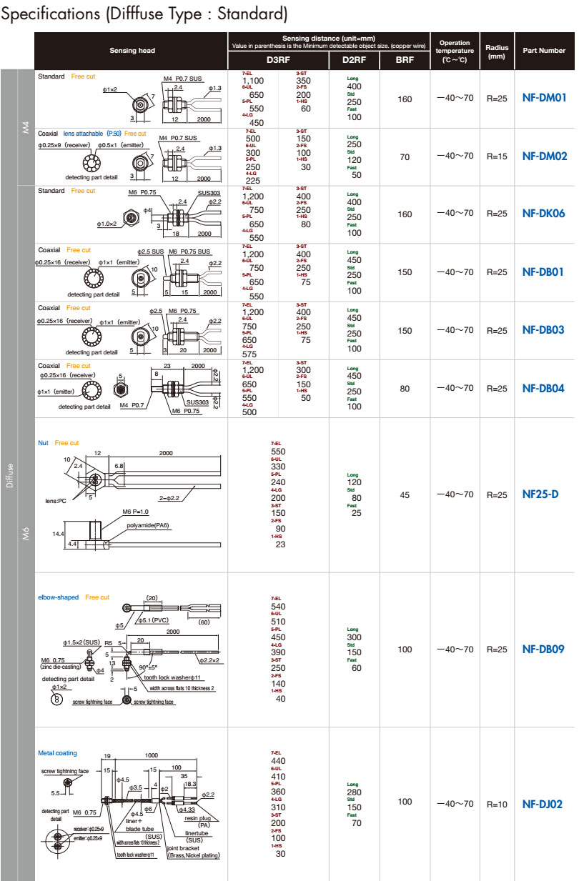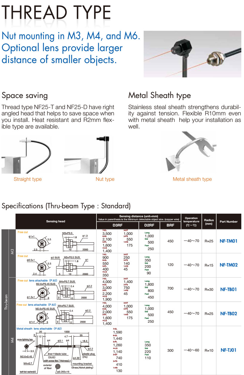 ● OPTEX-FA提供超过80多种类型的光纤,包括对射型和漫反射型
