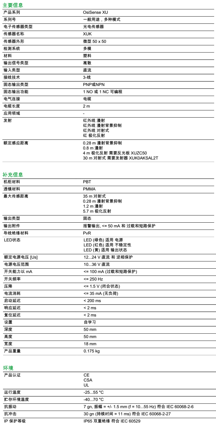 检测距离 0.28 m 漫射背景抑制; 0.8 m 漫射; 4 m 极化反射 需要反光板 XUZC50; 30 m 对射式 需要发射器 XUK0AKSAL2T;