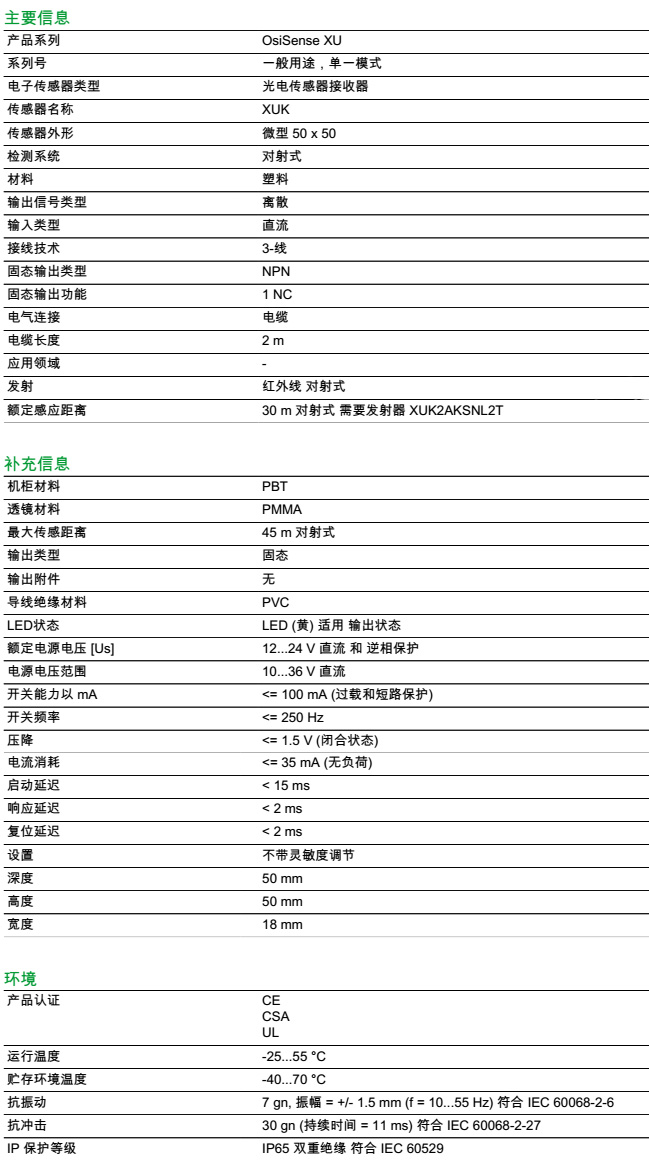 | 检测距离 | 30 m 对射式 需要发射器 XUK2AKSNL2T |
