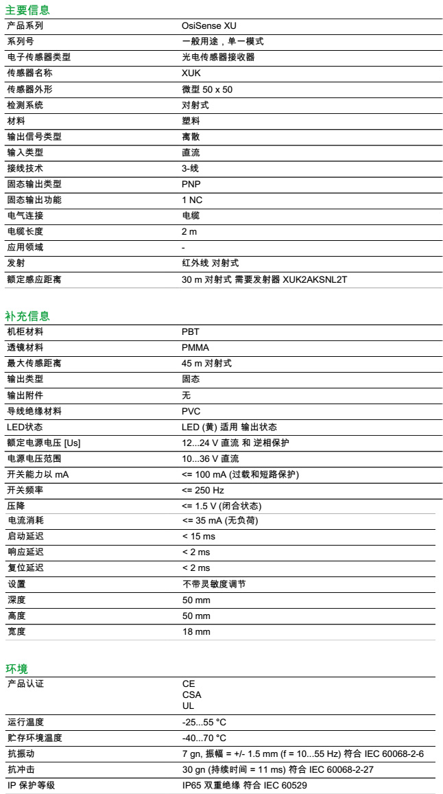 | 检测距离 | 30 m 对射式 需要发射器 XUK2AKSNL2T |