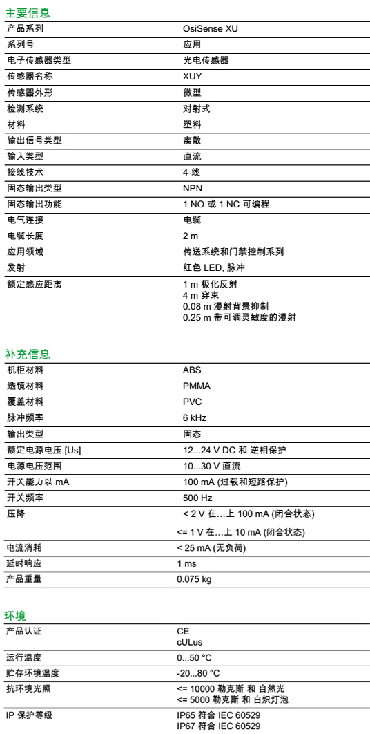 检测距离 1 m 极化反射; 4 m 穿束; 0.08 m 漫射背景抑制; 0.25 m 带可调灵敏度的漫射;