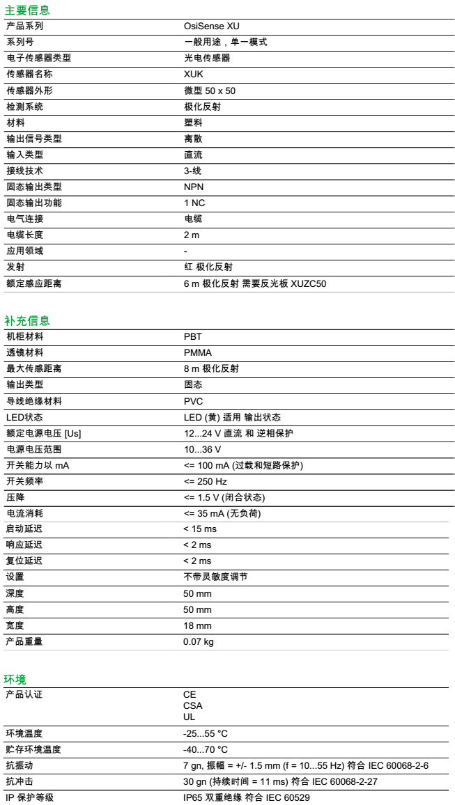 | 检测距离 | 6 m 极化反射 需要反光板 XUZC50 |