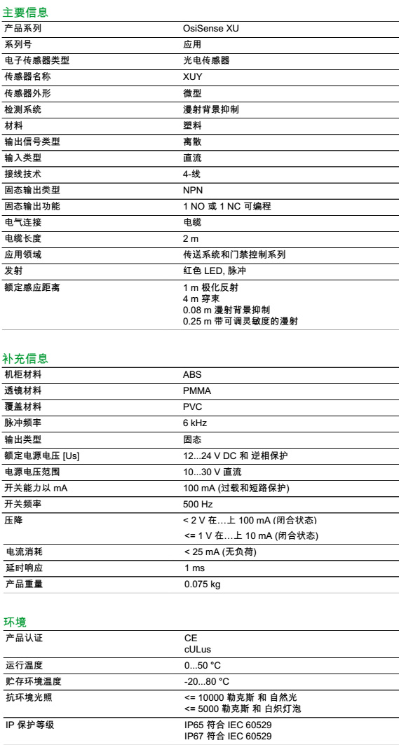 | 检测距离 | 1 m 极化反射; 4 m 穿束; 0.08 m 漫射背景抑制; 0.25 m 带可调灵敏度的漫射; |