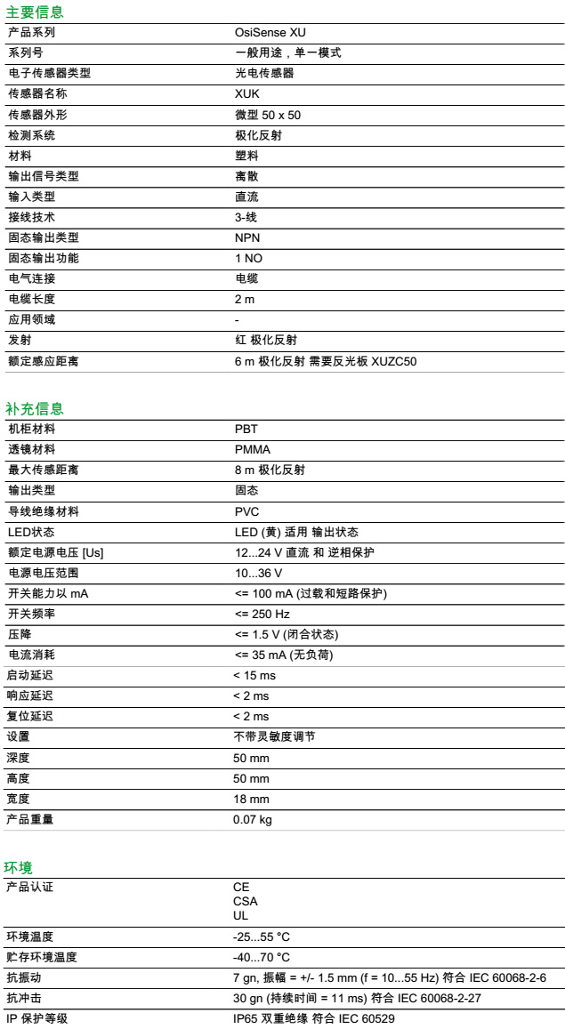 | 检测距离 | 6 m 极化反射 需要反光板 XUZC50 |