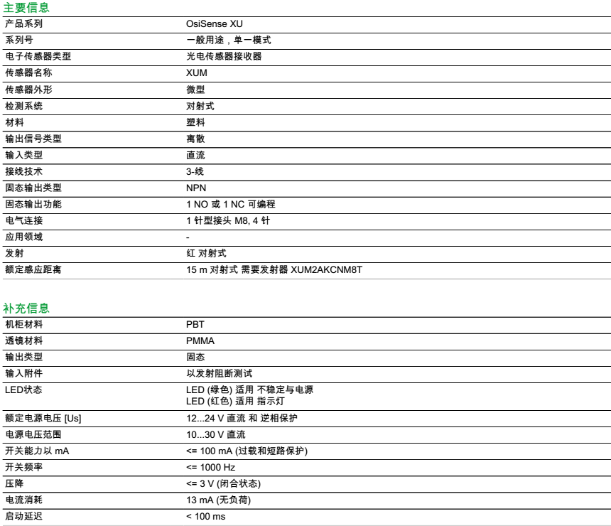 | 检测距离 | 15 m 对射式 需要发射器 XUM2AKCNM8T |