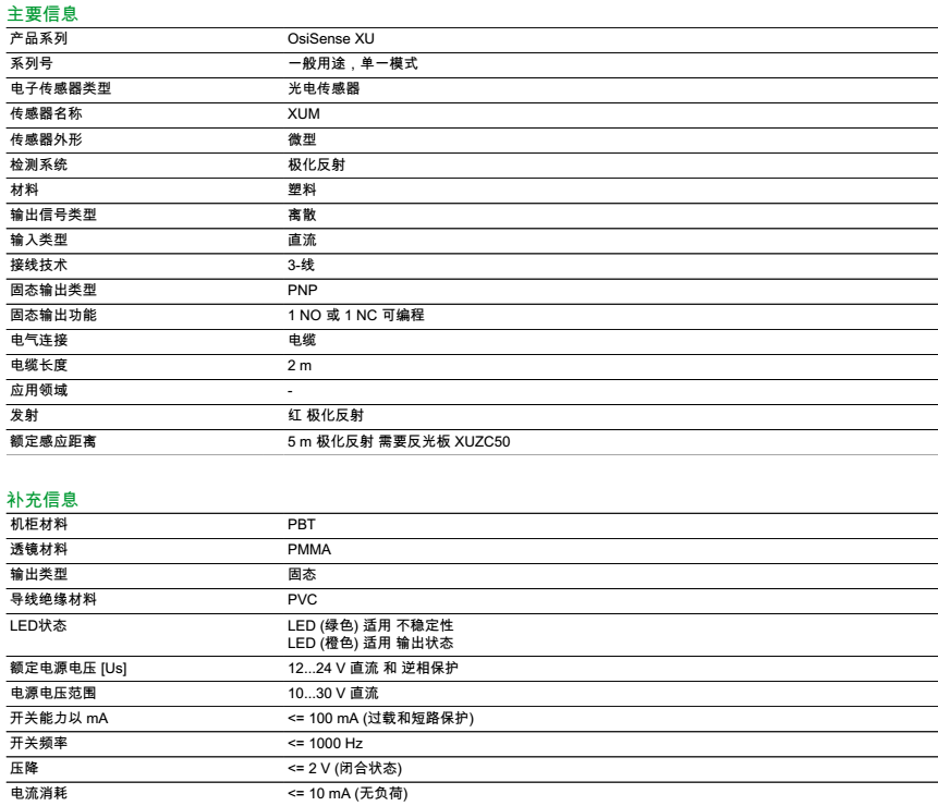 | 检测距离 | 5 m 极化反射 需要反光板 XUZC50 |