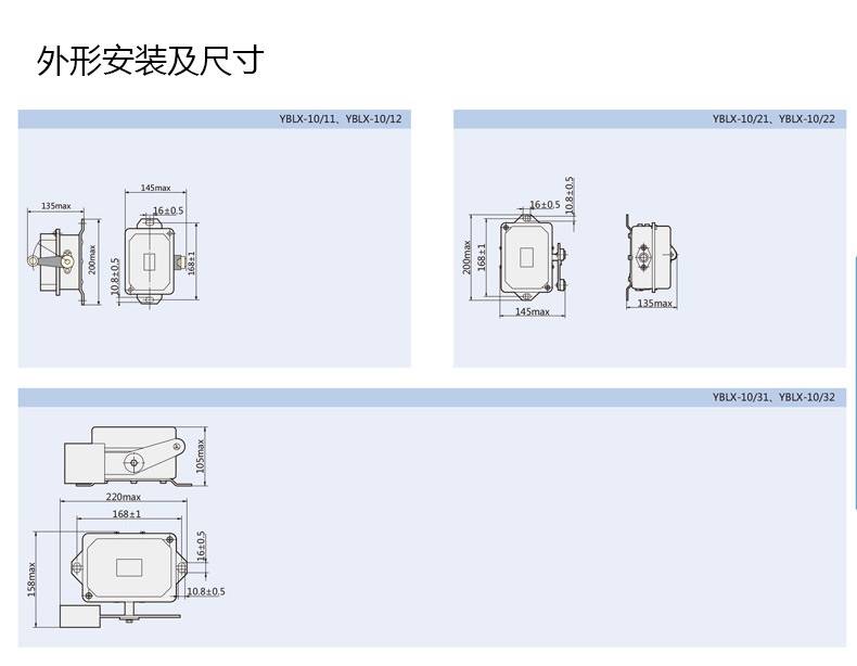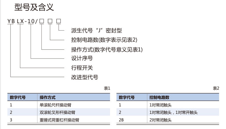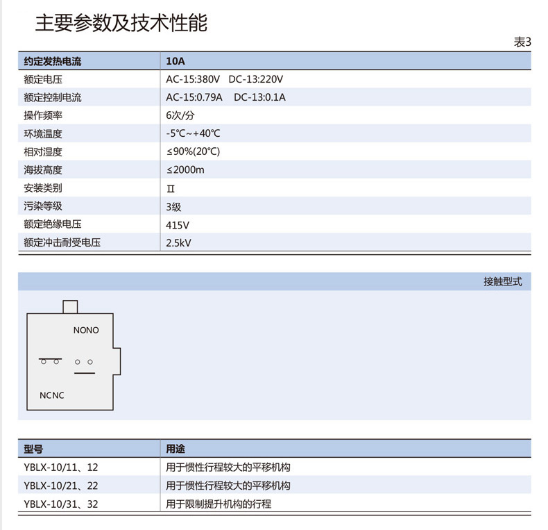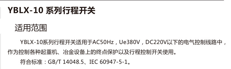 • YBLX-10系列行程开关适用于AC50Hz,Ue380V,DC220V以下的电气控制线路中,作为控制各种起重机、冶金设备上的终点保护以及行程控制开关使用