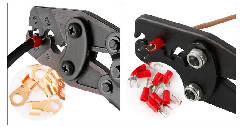 根据铝套管的粗细选择适当的线模装在压接钳上,拧紧定位螺丝后,把套有铝套管的芯线嵌入线模。