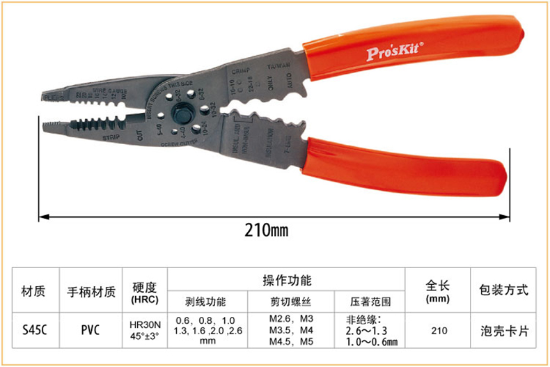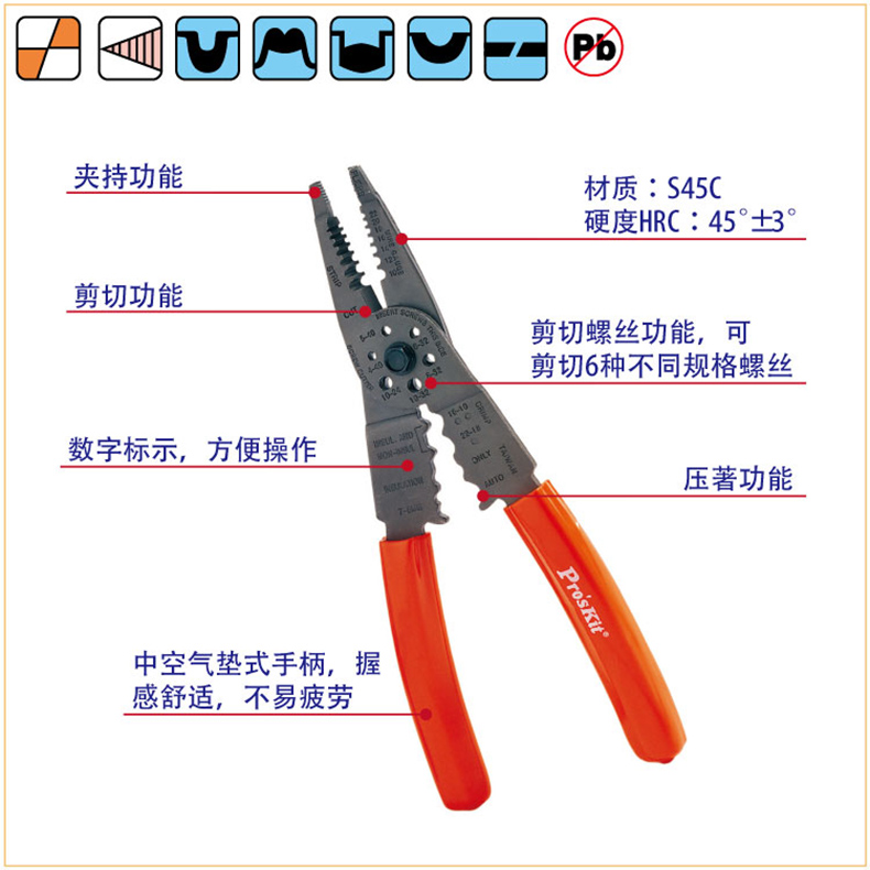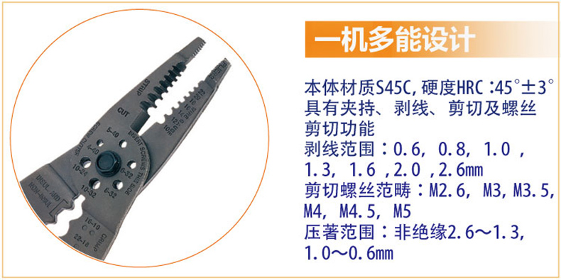 具剥线、夹持、剪切、剪切螺丝、压接功能。