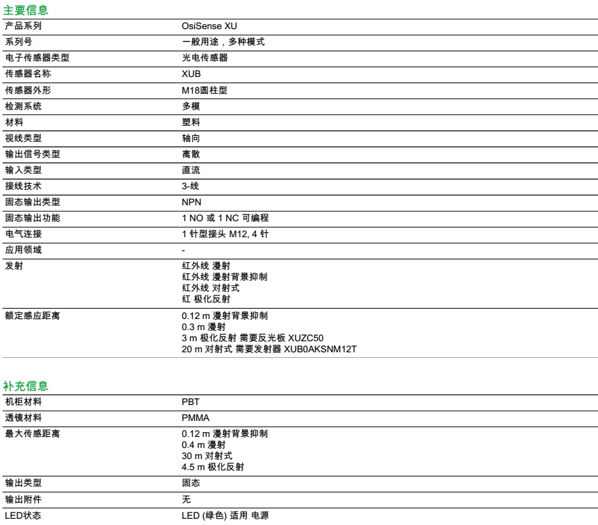 | 检测距离 | 0.12 m 漫射背景抑制;0.3 m 漫射; 3 m 极化反射 需要反光板 XUZC50; 20 m 对射式 需要发射器 XUB0AKSNL2T; |