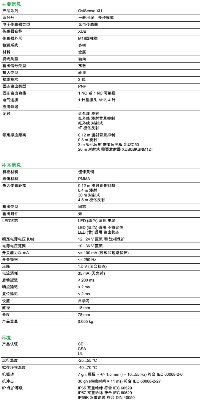 检测距离 0.12 m 漫射背景抑制;0.3 m 漫射; 3 m 极化反射 需要反光板 XUZC50; 20 m 对射式 需要发射器 XUB0BKSNM12T;