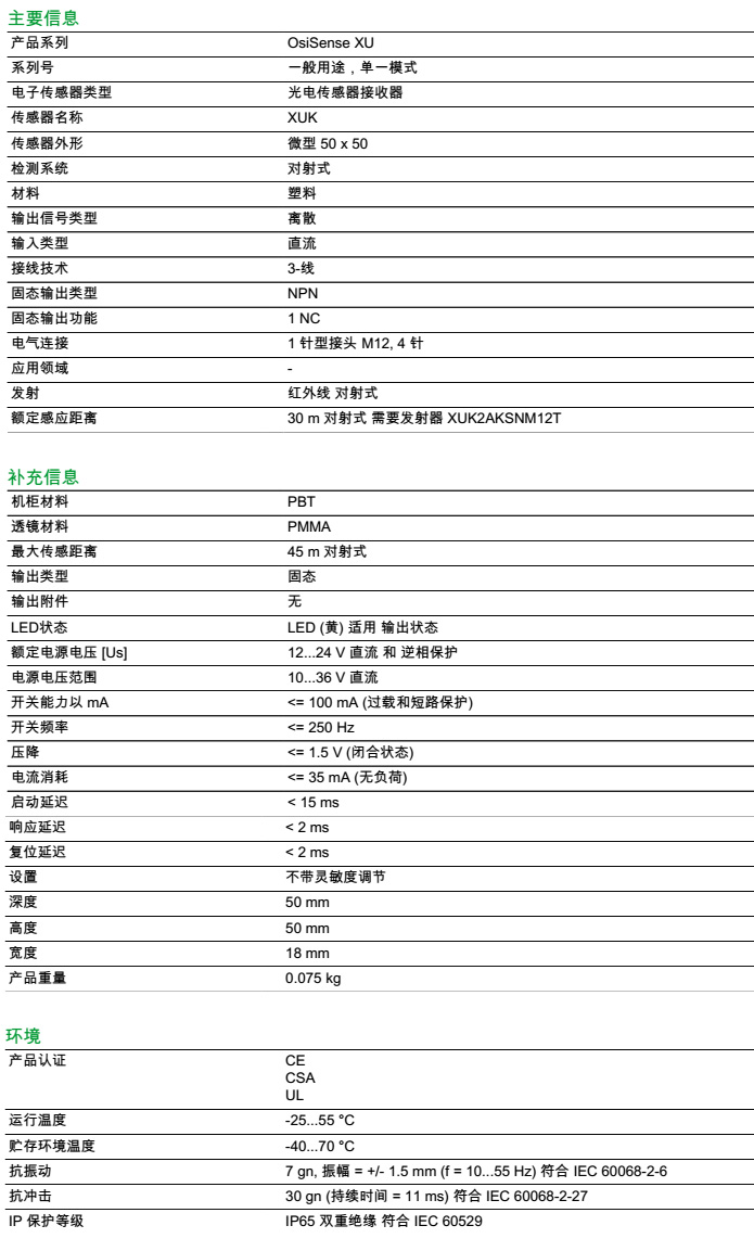 | 检测距离 | 30 m 对射式 需要发射器 XUK2AKSNM12T |