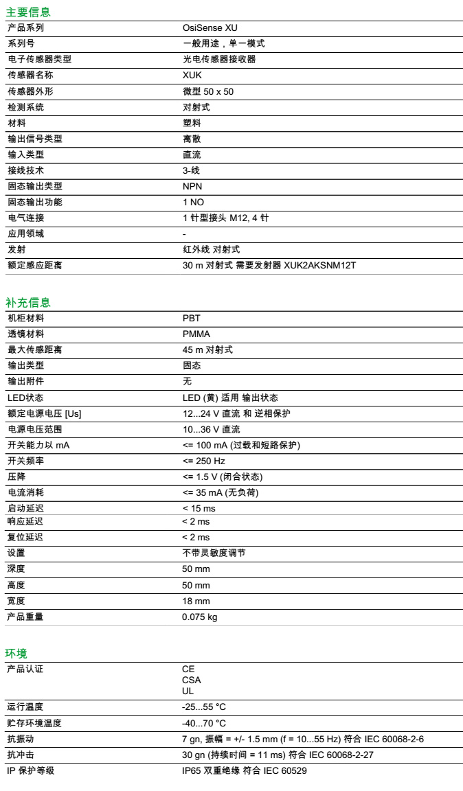 | 检测距离 | 30 m 对射式 需要发射器 XUK2AKSNM12T |