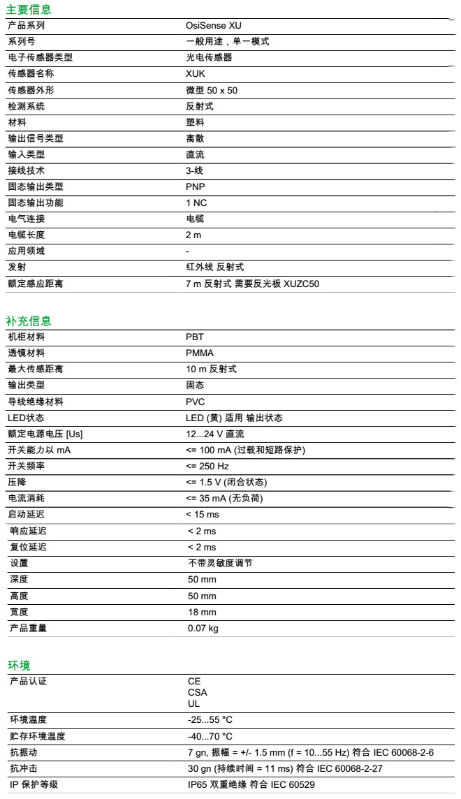 | 检测距离 | 7 m 反射式 需要反光板 XUZC50 |