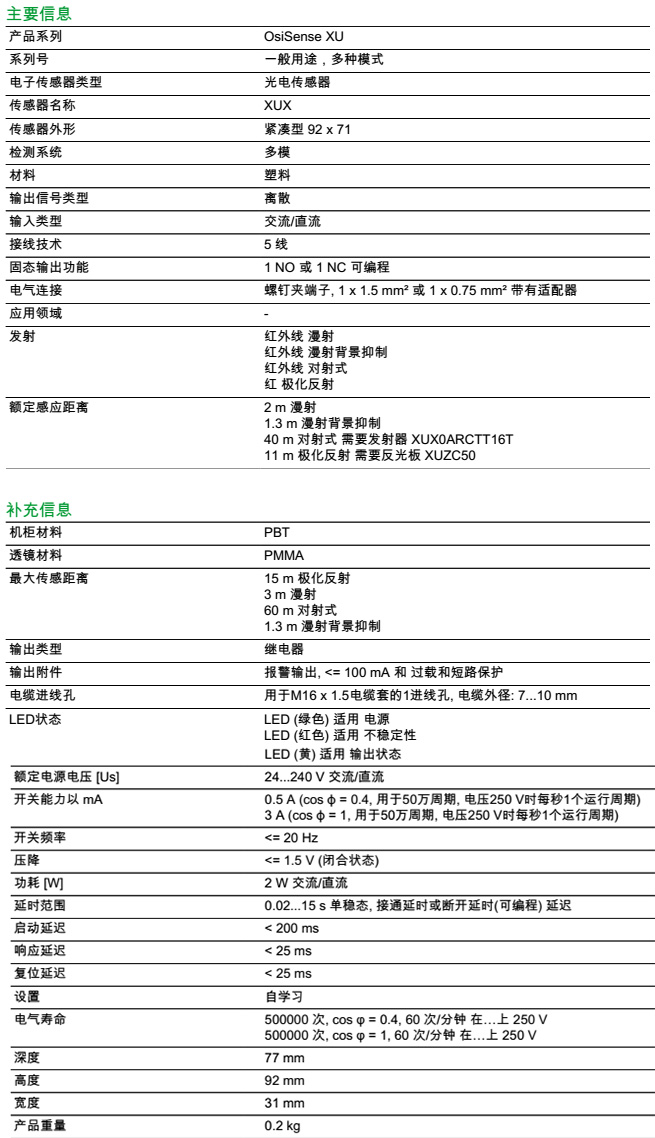 检测距离 2 m 漫射; 1.3 m 漫射背景抑制; 40 m 对射式 需要发射器 XUX0ARCTT16T; 11 m 极化反射 需要反光板 XUZC50;