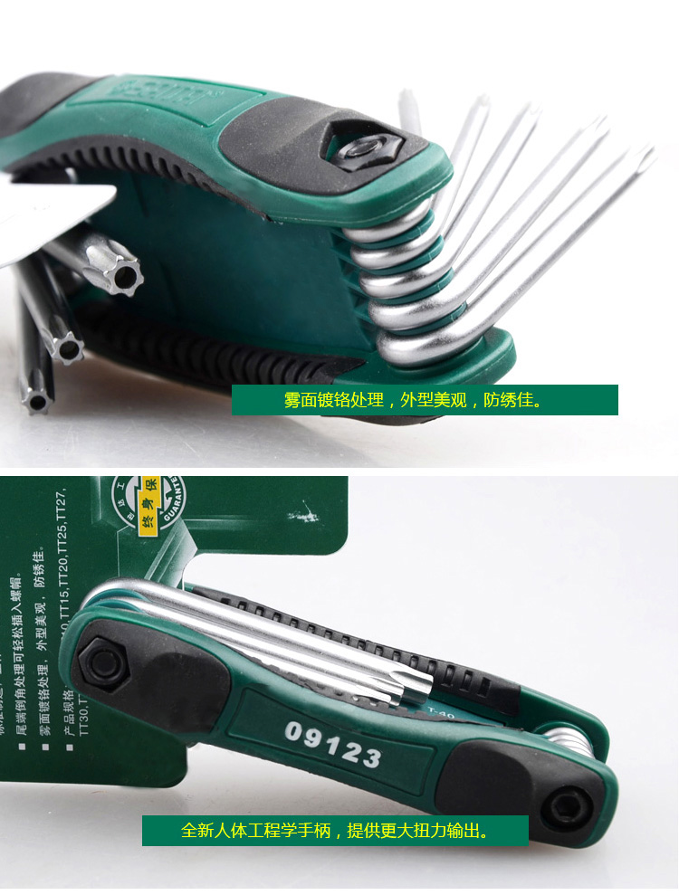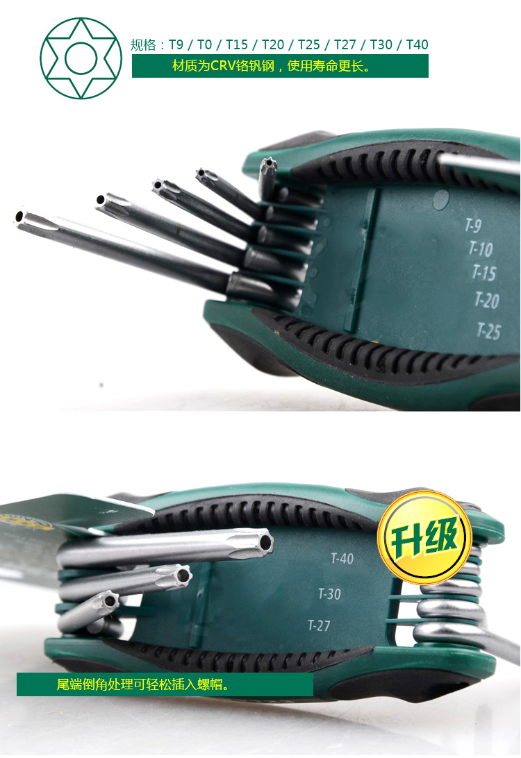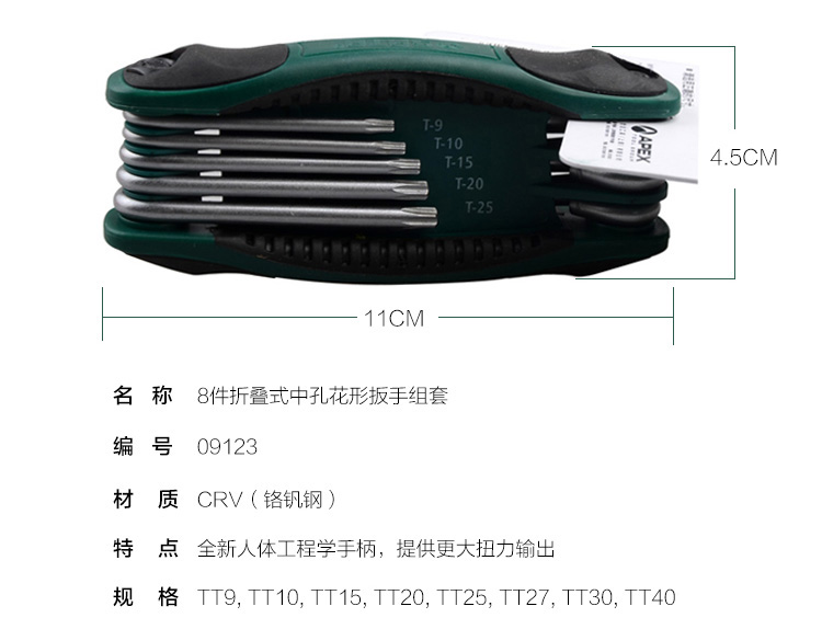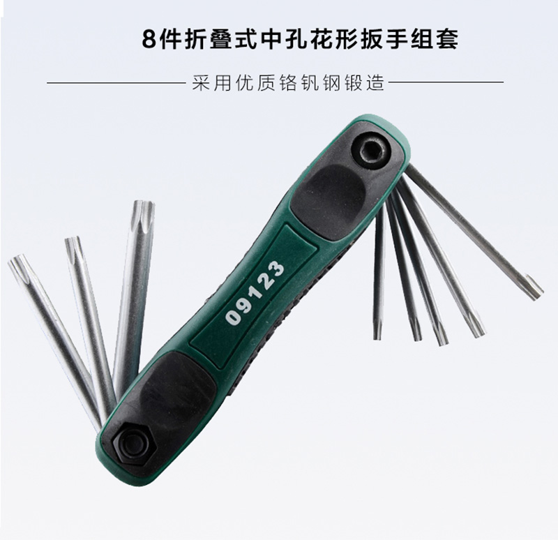 | 描述 | 8件折叠式中孔花形扳手套装 |