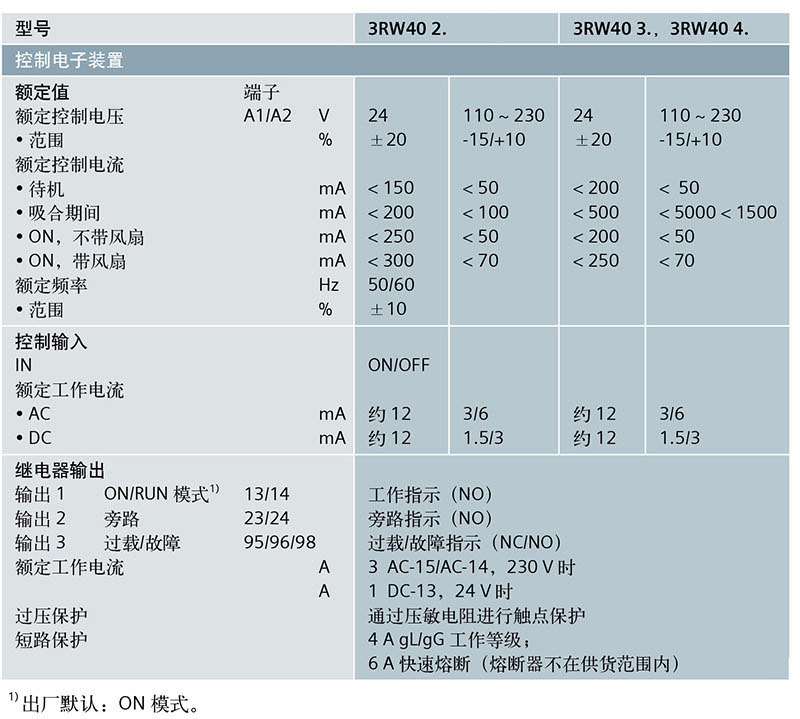作为选项,晶闸管也可由 SITOR 半导体熔断器提供短路保护,以便短路(协调类型 2)后,软起动器不被损坏。3RW40 软起动器应用了 3 个 LED 来指示工作状态及可能的故障,例如不允许的脱扣时间(脱扣等级设定)、电源或相位故障、负载缺失、热过载或设备故障。