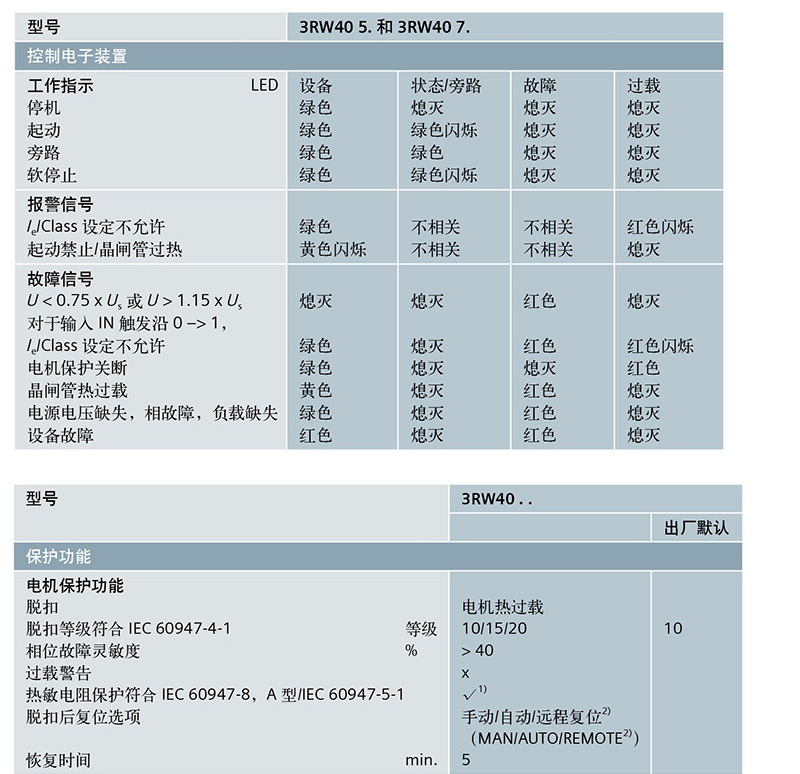 作为选项,晶闸管也可由 SITOR 半导体熔断器提供短路保护,以便短路(协调类型 2)后,软起动器不被损坏。3RW40 软起动器应用了 3 个 LED 来指示工作状态及可能的故障,例如不允许的脱扣时间(脱扣等级设定)、电源或相位故障、负载缺失、热过载或设备故障。