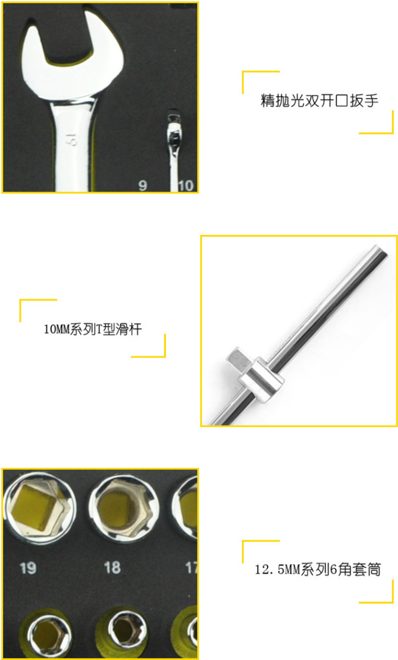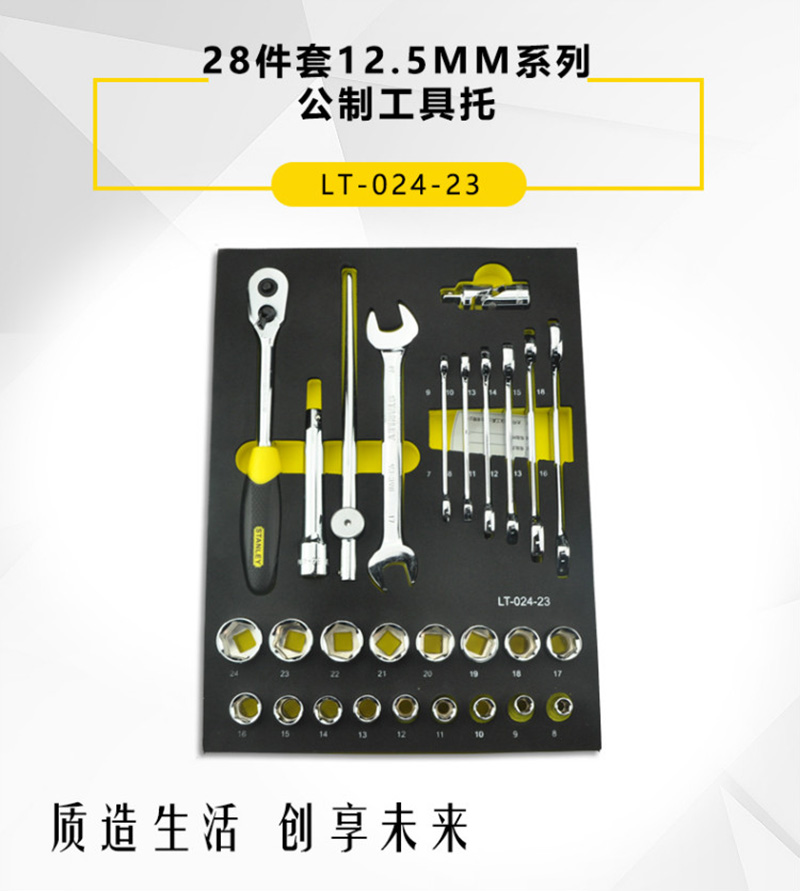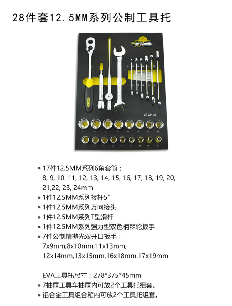 | 内含工具 | ·17件12.5mm系列6角套筒8,9,10,11,12,13,14,15,16,17,18,19,20,21,22,23,24mm ·1件12.5mm系列接杆5" ·1件12.5mm系列万向接头 ·1件12.5mm系列T型滑杆 ·1件1 |