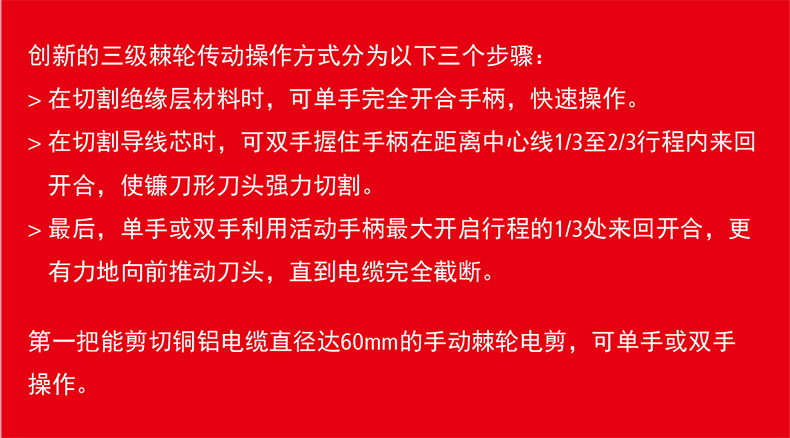 > 单手或双手剪切铜铝线,最大可剪切直径60mm