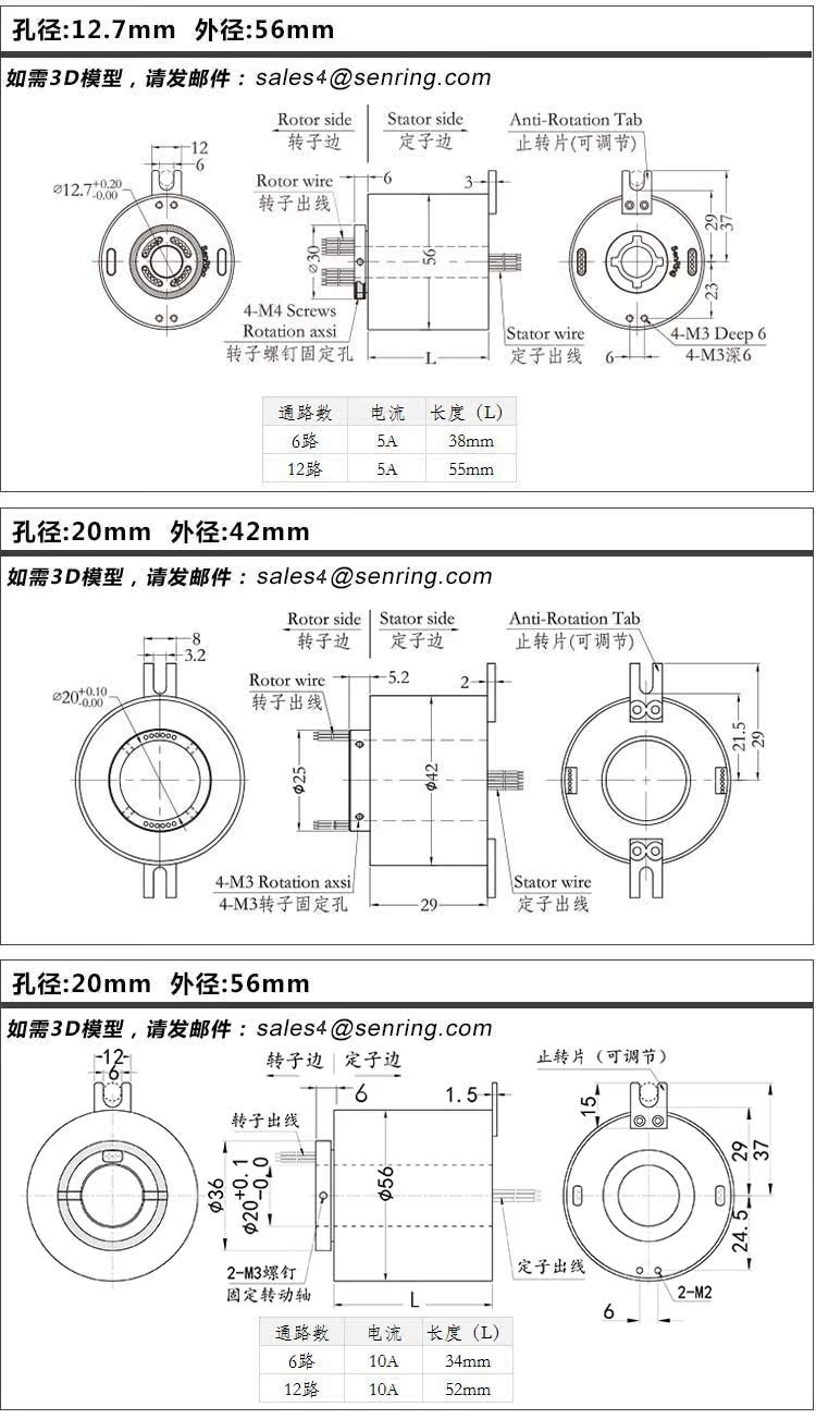 霍尔曼导电滑环,孔径20mm 外径56mm/6路10A